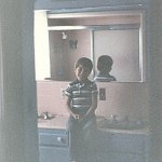 There is John, sitting on the counter, you can see the counter behind the door where the blood appeared, and the shower stall in the morror. The picture was taken from the hallway leading from the bedroom to the office.  Sorry about such terrible quality.