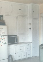We did actually come up with a reasonable explanation after many years. The house had been owned by one of the county's first circuit court judges during prohibition years. There was a false back to the top cupboard with a hidden, spring loaded hinge. If you stood on a ladder, leaned way into the deep 28" cupboard, you could push on the door and peer a bit into the space that led to the left, behind all the kitchen cupboards. Go around the corner from the kitchen to the hallway and you see, which you would have never noticed before, the built in linen cupboard doesn't go to the ceiling the way the others do. There was about fifteen inches of wall space above the linen cupboard. The secret space!! Now, put your hand under the top shelf, push up, the shelf is loose, sitting on supports all the way around. Reach up farther and you can actually reach the hook and eye latch, locking that top door in place. What a wonderous safe. Even if someone were to work out the latch, they would never suspect the false door behind all of it. And, it was just the right size for a rifle, let alone bottles of booze.....