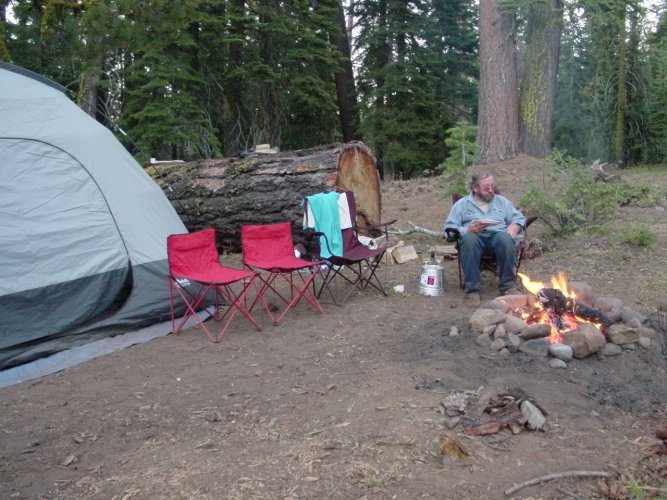 The campsite, Grandpa Dave at the fire