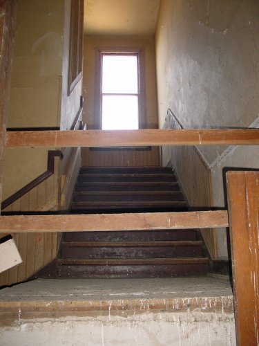 The main staircase on the second floor leading to the forbidden third floor.