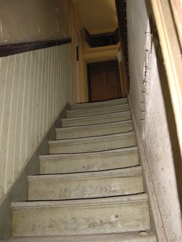 The Winchester stairway from kitchen in the basement to staff dining room on first floor The dining room is through the left door, straight ahead is the dumb waiter.