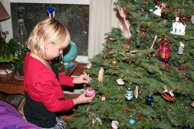 Emerie decorates the tree with Paige and Debra.