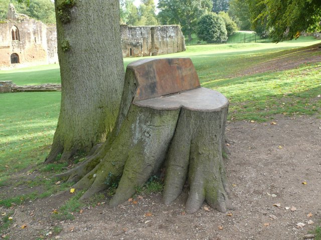 A wooden seat made from a tree with a few hundred years of initials carved in it. Who might have sat here?