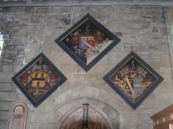 The crests of the three major families of EcclesfieldTop shield is unknown, the right is the Foljambes family, the left is the Shiercliffe crest.