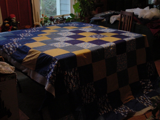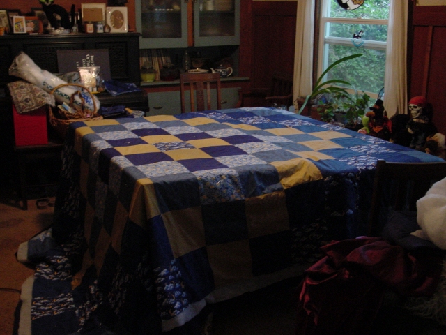 Jena sorta forgot to take anything warm with her to Germany, and I always wanted to make both my children a bed sized quilt. After I am gone, they can wrap themselves in my quilt and get a 'hug' from me. Quite a life's goal, huh? Anyway, this is Jena's second quilt, but first large on, and my very first bed sized quilt. Had to be a king, too. Groan. At least John didn't mind helping to pin it. Now all I have to do is quilt it. Hopefully, she will get it by winter. Hah. (What a mess!)