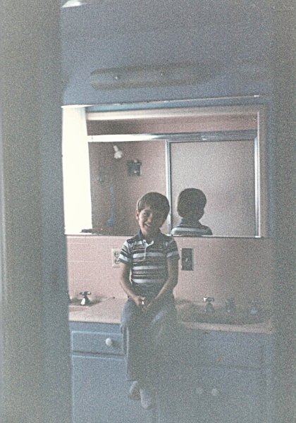 There is John, sitting on the counter, you can see the counter behind the door where the blood appeared, and the shower stall in the morror. The picture was taken from the hallway leading from the bedroom to the office. Sorry about such terrible quality.