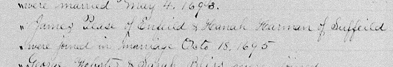 Picture of the book that recorded his marriage to "Hanah Harmon of Suffield"