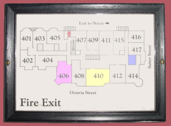 You have left the elevator. This is a map of the fourth floor. The elevator is blue, our room is pink, Mary Lake room is yellow. The stair way to the fifth floor is marked with an dark arrow.