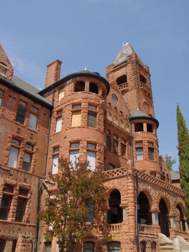 The center section with the two tower sections. The library is just above the porch in the right tower, with a school room between the towers.