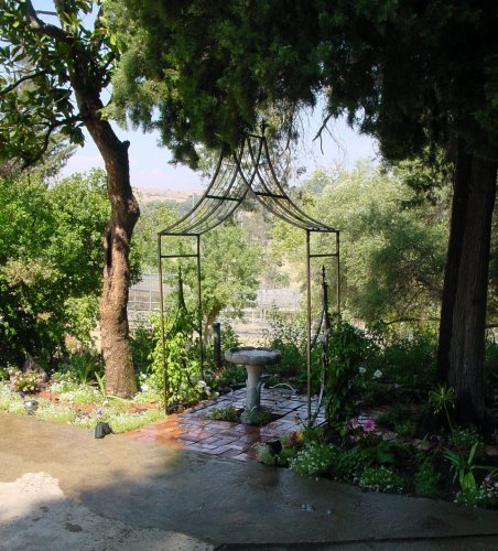 The lovely garden past the patio, behind the right wing