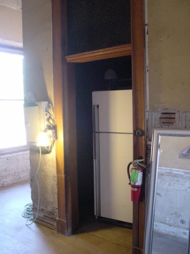 The elevator shaft inside the main staircase now holds a frig and the only light working that night