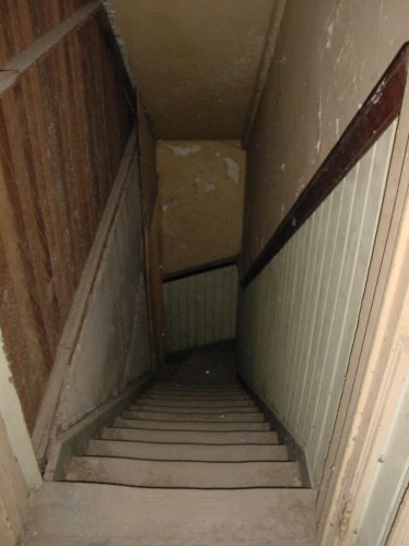 The spooky Winchester staircase leading from the staff dining room dumb waiter area to the kitchen in the basement