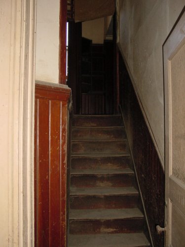 A staircase that leads no where some where on the second floor.
